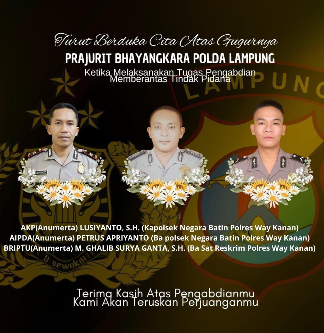 Lampung – Staf Sumber Daya Manusia (SSDM) Polri memberi kenaikan pangkat luar biasa (KPLB) anumerta kepada Kapolsek Nagara Batin Way Kanan AKP Anumerta Lusiyanto, Aipda Anumerta Petrus Apriyanto dan Briptu Anumerta M Ghalib Surya Ganta, yang gugur saat menggerebek sabung ayam di Way Kanan, Lampung. Surat petikan keputusan gugur dan KPLB anumerta ini diantarkan langsung oleh Kepala Biro Perawatan Personel (Karo Watpers) SSDM Polri Brigjen Budhi Herdi Susianto.