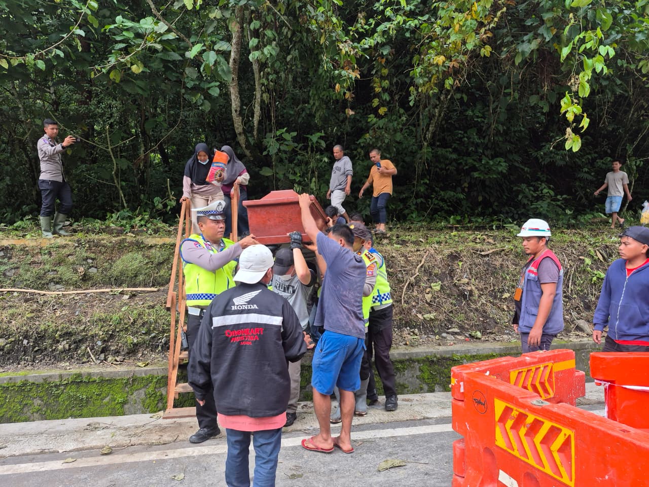 Dalam situasi genting tersebut, Polres Padang Panjang bergerak cepat. Personel kepolisian membuka jalur alternatif dan mendampingi proses pengantaran jenazah dengan penuh kehati-hatian melalui medan terjal dan berat.